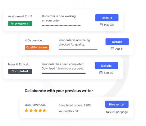 Have an urgent question for your writer? Initiate a live chat anytime. The message board in your account allows you to keep in touch with your expert and ensure everything goes just as planned. Note that you can change your password and login after profile validation.